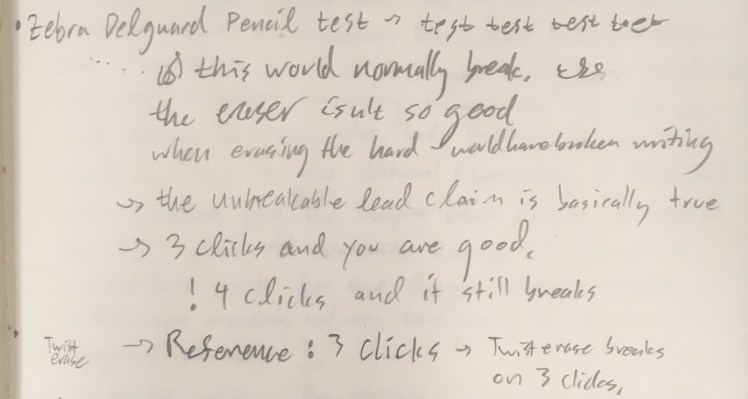 We then took the subway over to Bryant Park to visit Kinokunya, which a friend had told me about recently. Once there, Catie Marie Martin joined us and we found a bunch of really cool mechanical pencils. One of the pencils does this interesting thing where every time you press down on the lead it will rotate the lead, keeping the tip rounded off. Another pencil I found pushes out the lead when you shake it, so you don’t have to push it out yourself. Another had a pencil, a black, and a red pen inside it that would come out depending on what orientation you held it. And I bought one that has a spring loaded action that causes the lead to not break under pressure that would otherwise cause it to snap (as demonstrated below in terrible handwriting).