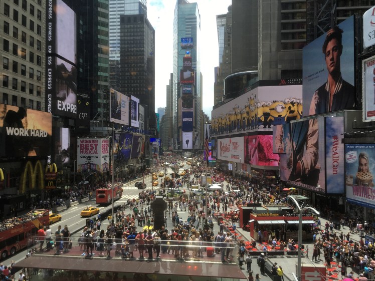 Annie, one of the people I met at Jefferson Lab in Virginia, who is studying physics in Mexico, decided to visit NYC for the 4th of July weekend and invited me to show her around and go to some museums. I took the train into the city and went to meet her in Times Square to get her a half-off ticket to a Broadway show. I really dislike Time Square, so I waited in the nearby Renaissance hotel, read a book for a while, and snagged a great shot of the crowd outside.