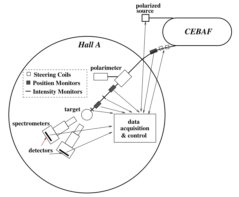 Jefferson Lab is centered around the Continuous Electron Beam Accelerator Facility (CEBAF) which is an electron particle accelerator that operates with high beam current and a high degree of electron polarization. The electron beam is produced by a laser system in the injector and then circles around the accelerator several times, adding 1 GeV of energy (more than 2000 times the at rest, mass only energy of an electron) through each linear accelerator segment pass. After 6 passes of the entire accelerator, recirculating through magnetic bending arcs on the west and east sides of the system, the beam will have reached 11 or 12 GeV and is ready to be delivered to the experimental halls for scattering against fixed targets.