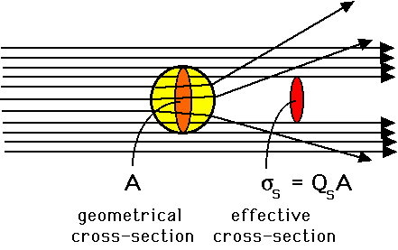 Quantum scattering can be understood at a variety of levels. The simplest way to approach scattering experiments is to imagine that you are not able to directly see an object with visible light and your own eyes, but you want to use some sort of probe that is able to interact with the object to determine its physical presence, quantity, and size. An example is to imagine throwing darts in a flat random distribution past a mystery object and then checking the shadow of the dart pattern on the wall behind it. As you increase the number of darts you will get a more precise and crisper image of the shadow of the object on the wall. Additionally, if you know the area of the pattern you threw the darts and how many you threw and count how many are missing then you can calculate the area of the object that absorbed them as the relative difference, even if it is a strange shape that is difficult to make out – this is called a cross-section measurement, because it is sensitive to the spatial area of the 2-D cross-sectional slice against which you projected your projectiles. This is the basic idea behind measuring cross-sections for quantum scattering processes, explained in more detail later, and is also the key idea behind Monte Carlo random sampling for simulations of expected outcomes for either large complicated or intrinsically probabilistic (quantum mechanical) systems.