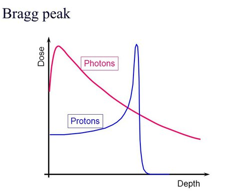 For massless particles (photons) their radiation vs. distance travelled is exponentially reduced vs. depth, when approximated as a linear attenuation of energy absorption passing through matter, though there is some scattering that complicates the picture and makes the dose profile fuzzier around the edges. For photons, much of the energy is deposited at the entry range, which is compensated by irradiating from many angles to increase the dose in the central target region. For proton therapy, in addition to having less radiation lost in the entry regions and fewer angles irradiated, also the central region dose is more tightly controlled. This permits irradiation of tumors in sensitive small areas, such as the brain or prostate, and provides the improved precision necessary for treating smaller patients such as children.