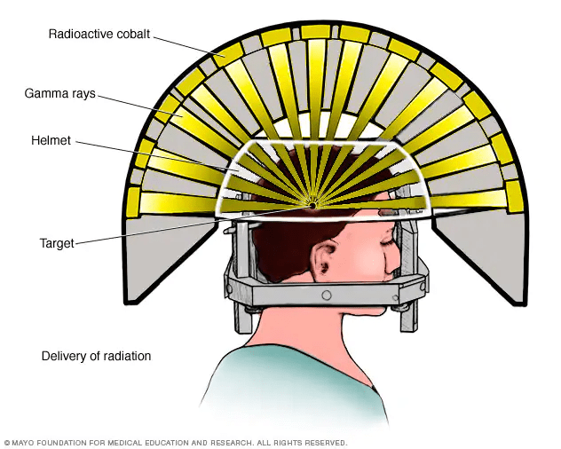 A traditional modality of radiosurgery to consider is that coming from static radioactive sources, such as the Gamma Knife system that utilizes radioactive Cobalt-60 irradiating gamma rays (high energy photons resulting from nuclear radioactive decays) from multiple angles onto tumors.